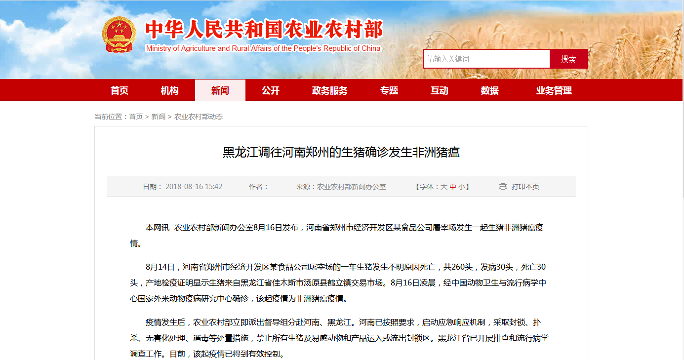8月14日,河南省郑州市经济开发区某食品公司屠宰场的一车生猪发生不明原因死亡,共260头,发病30头,死亡30头,产地检疫证明显示生猪来自黑龙江省佳木斯市汤原县鹤立镇交易市场。8月16日凌晨,经中国动物卫生与流行病学中心国家外来动物疫病研究中心确诊,该起疫情为非洲猪瘟疫情。