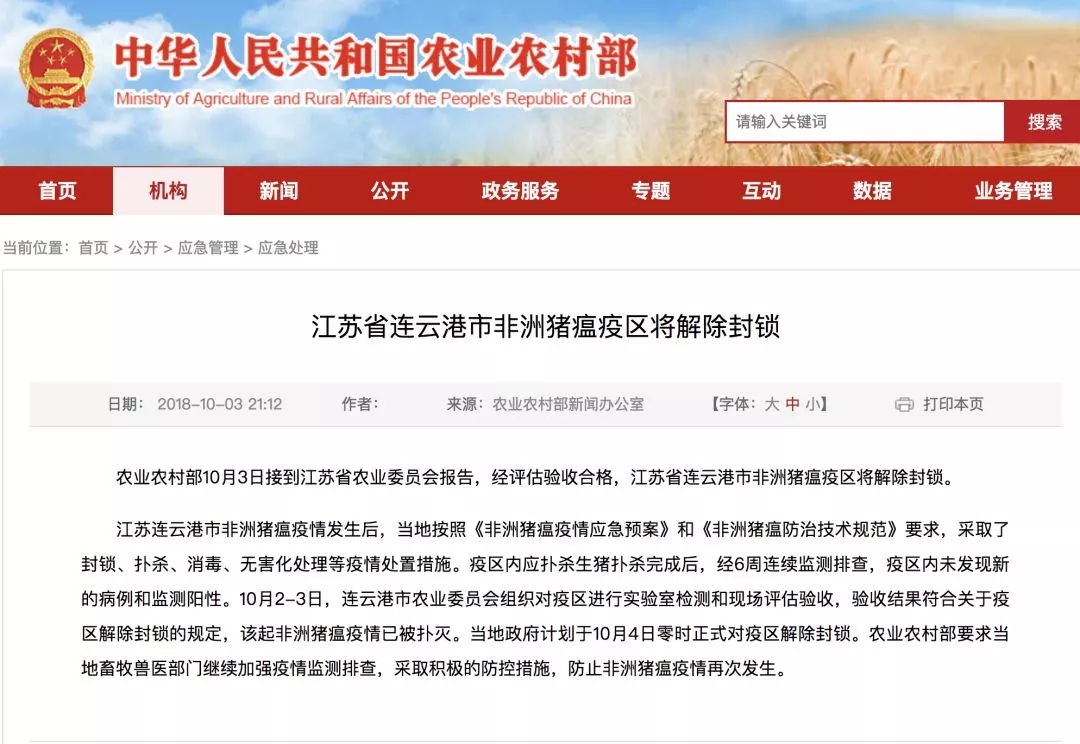 农业农村部10月3日接到江苏省农业委员会报告,经评估验收合格,江苏省连云港市非洲猪瘟疫区将解除封锁。