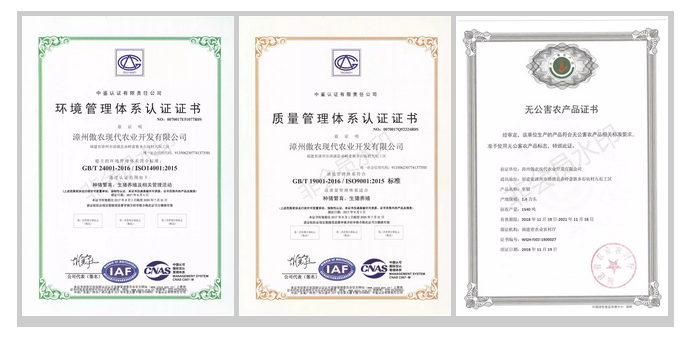 (从左往右依次为:环境管理体系认证证书、质量管理体系认证证书、无公害农产品证书)