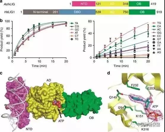 2019年1月23日,复旦大学甘建华、李继喜及四川大学/佐治亚州立大学黄震共同通讯等在Nature Communications 上发表题为“Structure of the error-prone DNA ligase of African swine fever virus identifies critical activesite residues”的文章,报道了四个独特的活性位点残基(AD结构域的Asn 153和Leu 211;OB结构域的Leu 402和Gln 403)对AsfvLIG的催化效率至关重要。