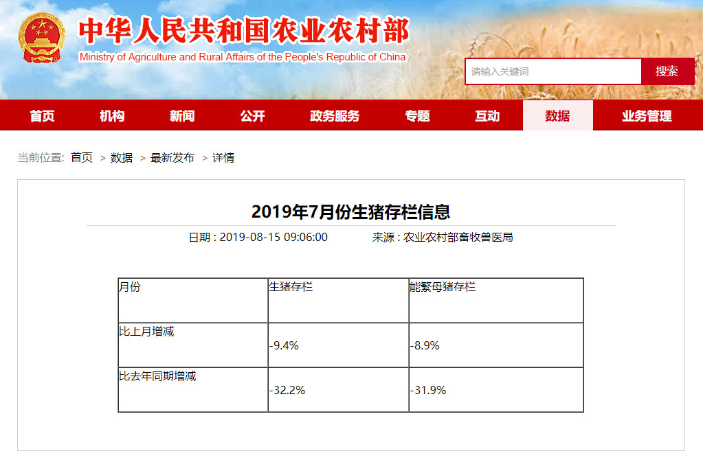 农业农村部发布7月份生猪存栏信息,与去年同期相比,生猪存栏 -32.2% ,能繁母猪存栏 -31.9% 。
