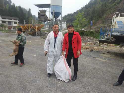 在猪仔发放现场,高兴春场长一边发放猪仔,一边向贫困户传授养猪技术、经验和注意事项。