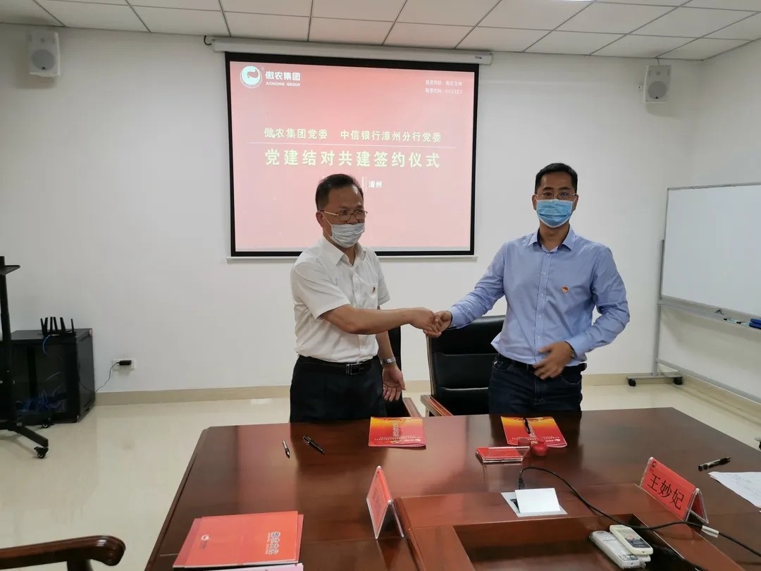 图/中信银行漳州分行党委副书记、纪委书记颜亚伟,集团党委副书记、人力资源中心总经理匡俊作为双方代表签署党建结对共建协议书并合影。