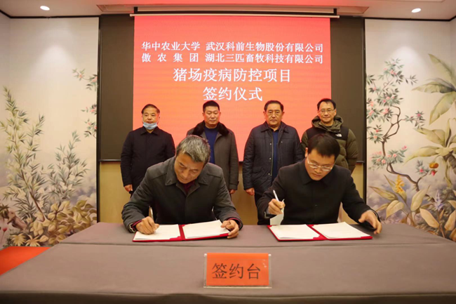 武汉科前生物汤细彪博士和湖北三匹副总经理赵金铭作为双方代表签署合作协议。