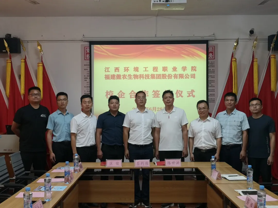 生态建设与环境保护学院党总支副书记彭阳、办公室主任陈日辉、环境工程技术专业教研室主任申露威,集团漳州傲锐公司总经理曾文平、人力资源中心人才开发部总监罗波文、养猪产业江西区人事总监叶俊松、养猪产业环保与设备运营中心经理刘藤徽参加签约仪式。