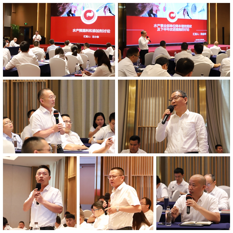 杨州、赖军、贾铁军、汪小东、孙陆宇、任守国、高扬、张书金、顾宁等参会代表先后就水产事业部上半年经营情况通报和财务工作沟通、原料采购及行情、水产技术、水产动保、生产管理、质量管理、供应链金融工作沟通等方面进行分享交流。