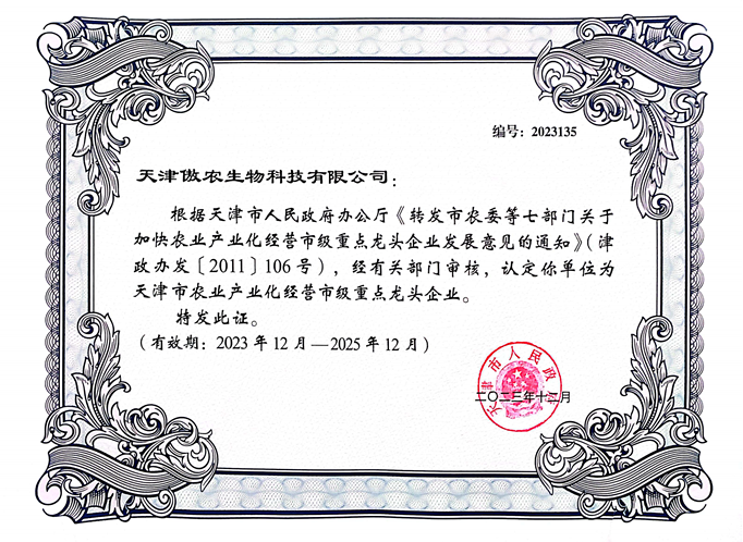 近日,天津德信网页版生物科技有限公司(以下简称:天津德信网页版)荣获“天津市重点龙头企业”称号,这一殊荣是对天津德信网页版积极发展现代农业、强化创新驱动、筑牢品牌优势等发展成绩的肯定与褒奖。