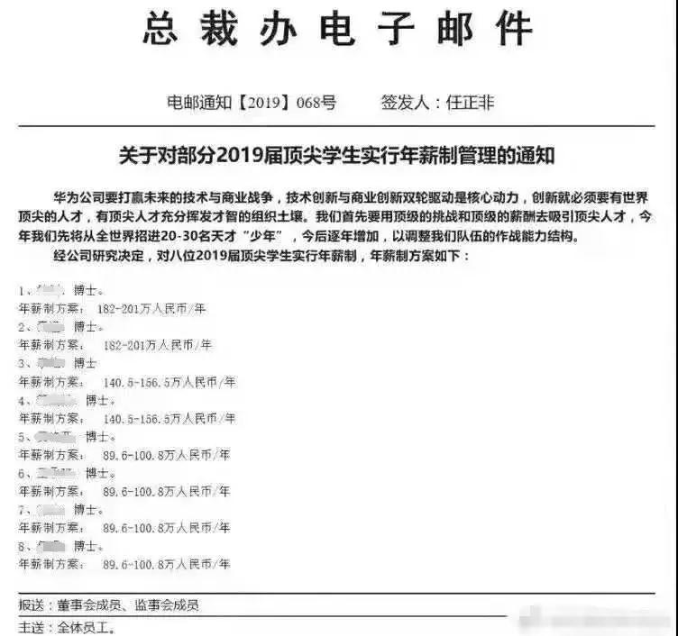 有消息称,华为总裁办签发的最新电子邮件显示:华为对部分2019届顶尖学生实行年薪制管理,年薪为100万—200万元不等。